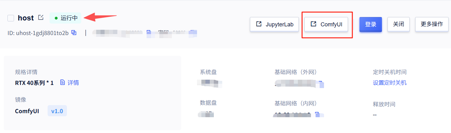 实例启动后,如箭头所示,会显示“运行中”,在控制台中点击“Comfyui”(如果打不开,就稍等一两分钟再点击尝试,有时刚开机会有点慢)