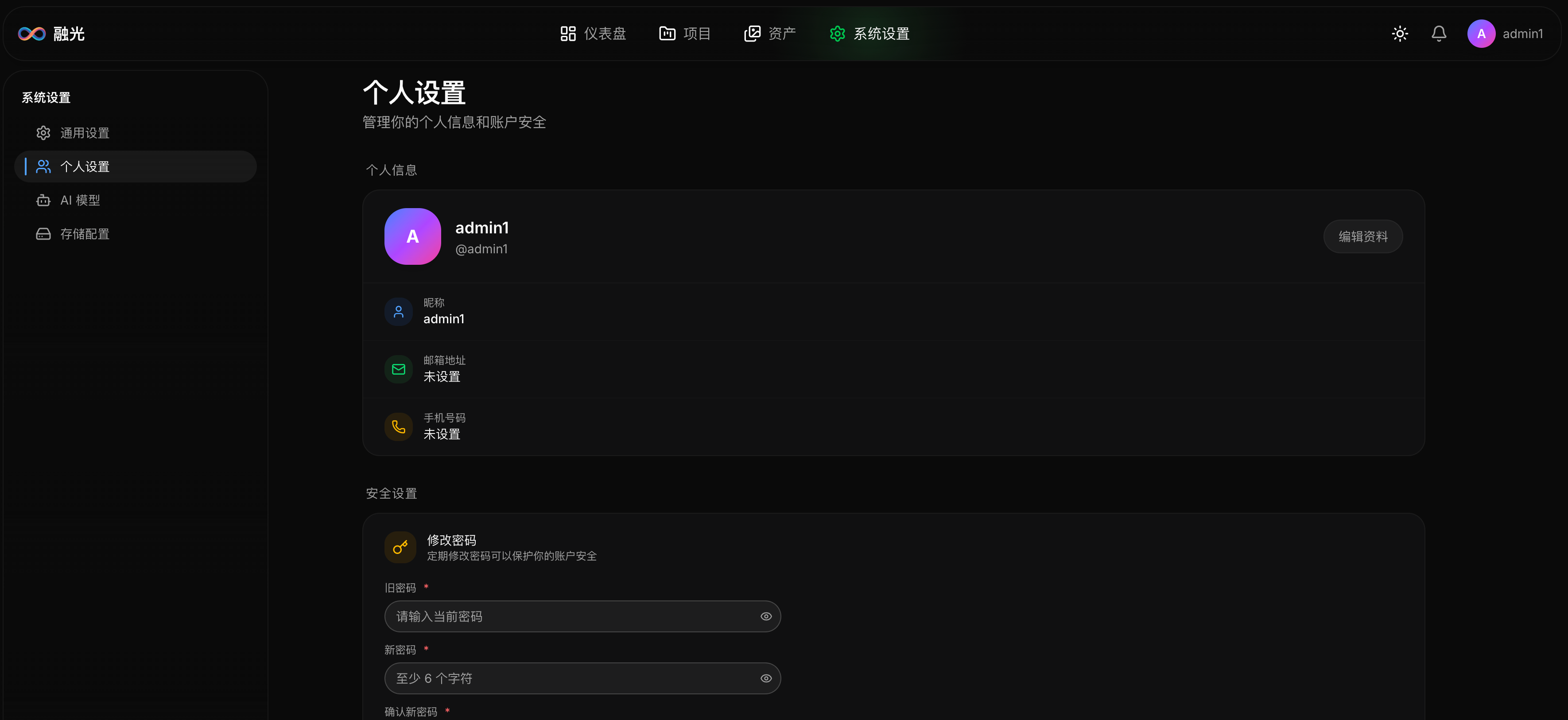 系统设置 → 个人:修改昵称、邮箱、手机号、密码。