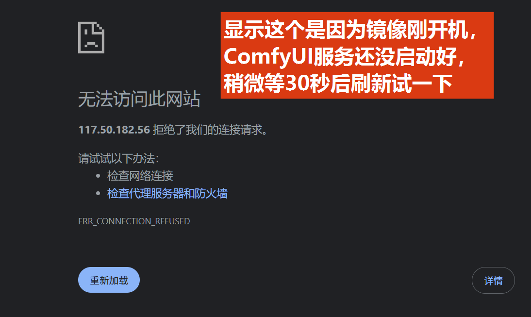 等待部署好后,约30秒后,ComfyUI服务启动完成,点击 【ComfyUI】 打开工作台主界面。