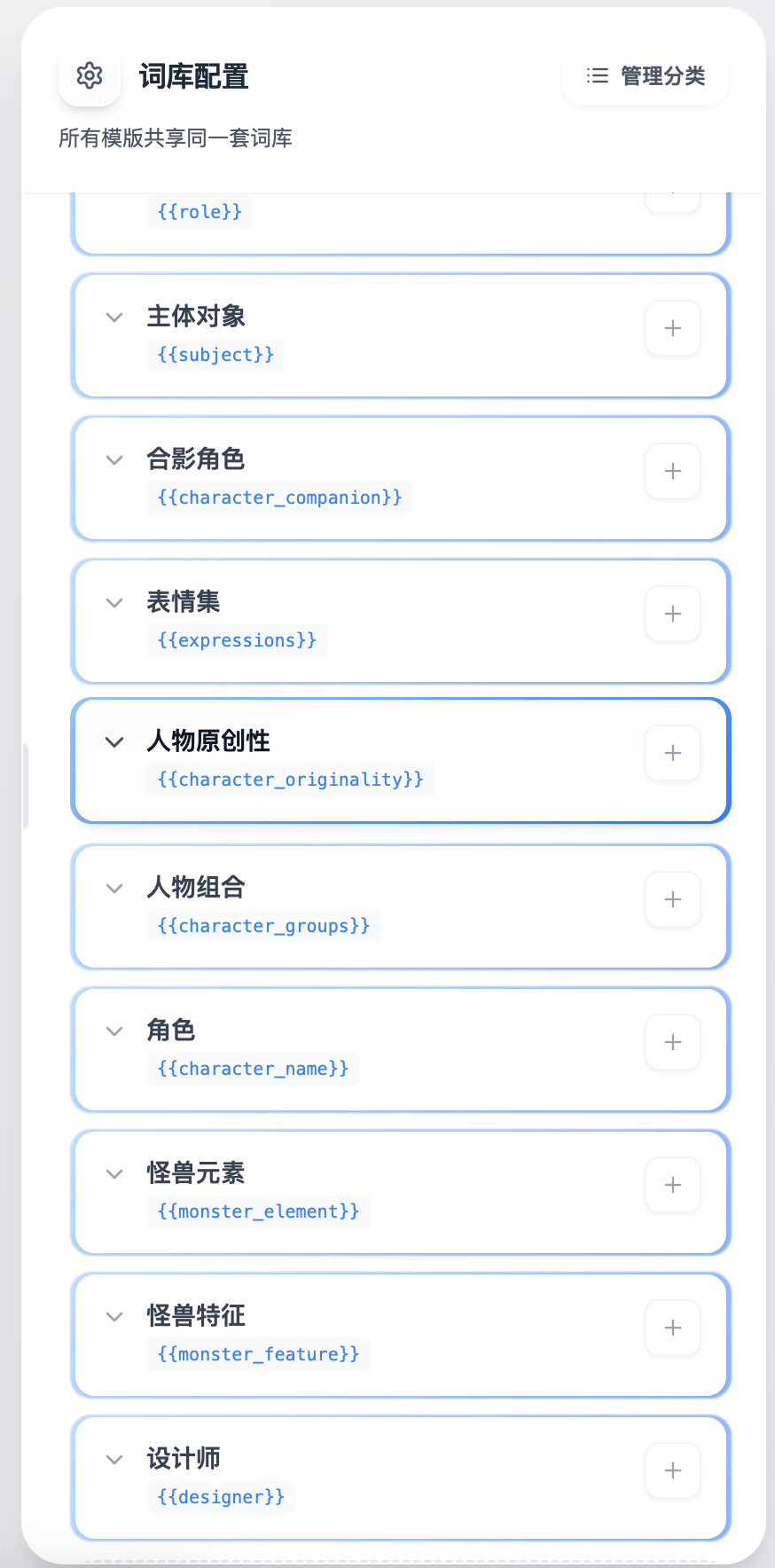 - 分类(Categories):用于组织词库的标签,如"人物"、"动作"、"画面"等,每个分类有独特的颜色标识