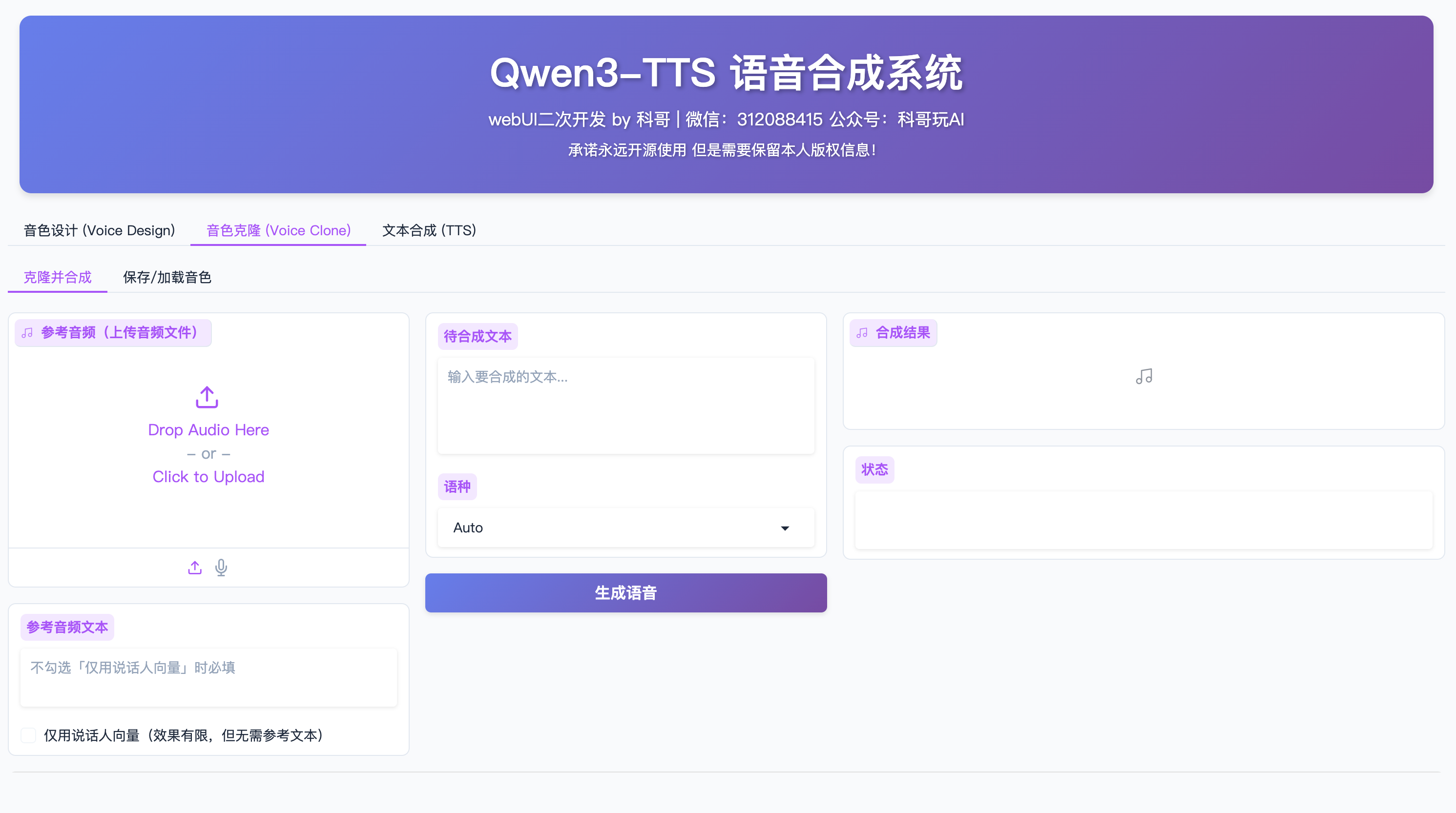 Qwen3-TTS 是一个强大的文本转语音(TTS)系统,支持多种音色生成方式。本 WebUI 提供了友好的图形界面,让您轻松生成高质量的语音。