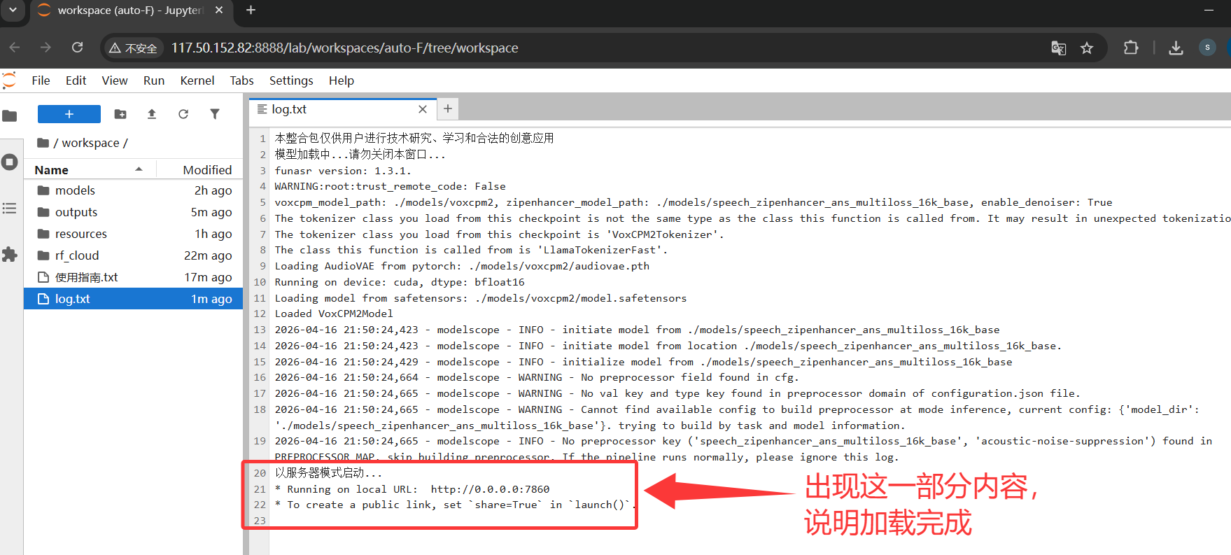 该镜像支持自动启动,启动日志可以去JupyterLab中的/workspace目录下的log.txt查看,启动成功的日志如下: