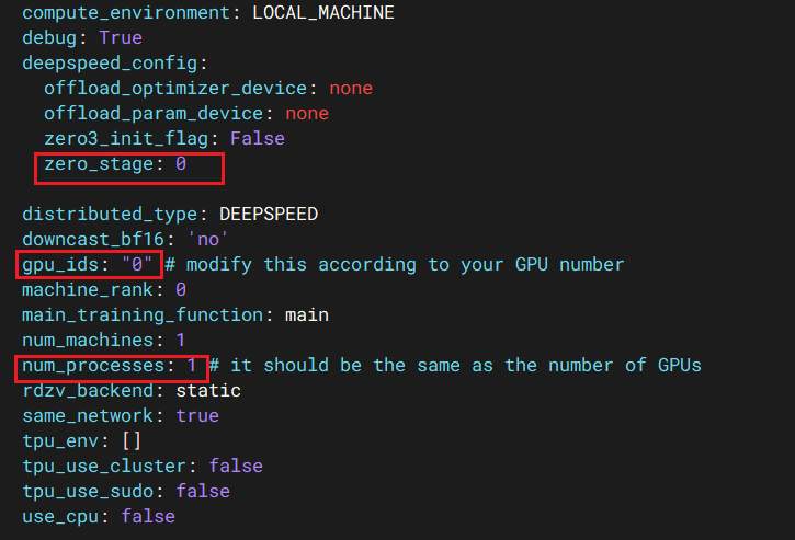 gpu_ids: 使用的GPU的id,如果电脑只有一张显卡,默认是 0num_processes: 只有一张显卡,则写1;应该与gpu_ids中的数量一致zero_stage: DeepSpeed 里的大模型显存优化技术。如果报错,需要改成 0这个文件我已经修改好,无需修改