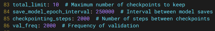 total_limit: 保存 checkpoints 最大数量save_model_epoch_interval: 模型保存间隔checkpointing_steps: checkpoint 保存间隔val_freq: 验证频率==需要快速验证建议调小==