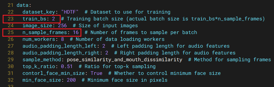 data.train_bs: Smaller batch size due to high GPU memory cost (default: 2)data.n_sample_frames: Higher value for temporal consistency (default: 16)