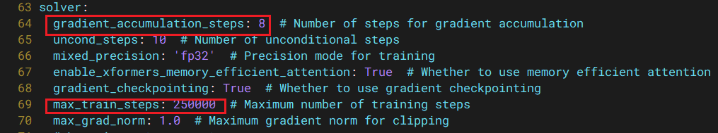 solver.gradient_accumulation_steps: Increase to simulate larger batch sizes (default: 8)solver.max_train_steps: 最大训练步骤,如果希望快速验证,可调整此参数